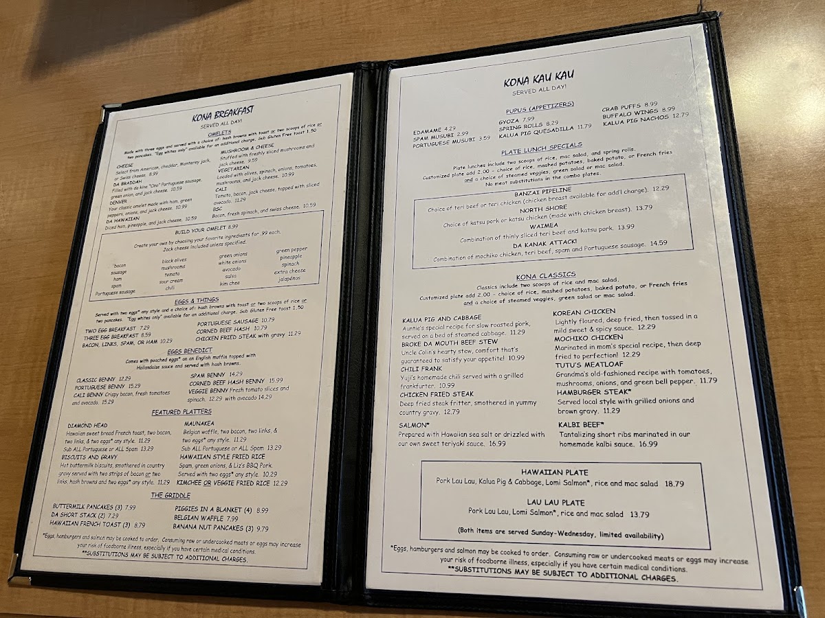 The spirit of aloha shines through in every dish, and the menu is brimming with enticing options. One of the standout items is the Da Kanak Attack, a hearty combination of mochiko chicken, teri beef, spam, and Portuguese sausage, beautifully presented with two scoops of rice and creamy mac salad for just US$18.99. Another favorite, the North Shore, offers your choice of katsu pork or katsu chicken, also accompanied by rice and mac salad, priced at a humble US$18.59. If you’re after something sweet to start your day, the Hawaiian French Toast is a must-try at US$12.79, drizzled with syrup and served fluffy and warm, it embodies the comfort of home.